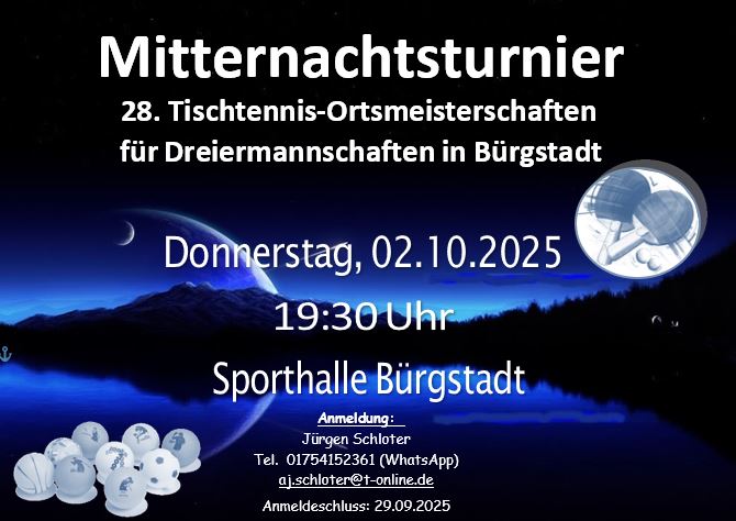 Einladung zu den 28. Tischtennis-Ortsmeisterschaften/ Mitternachtsturnier
