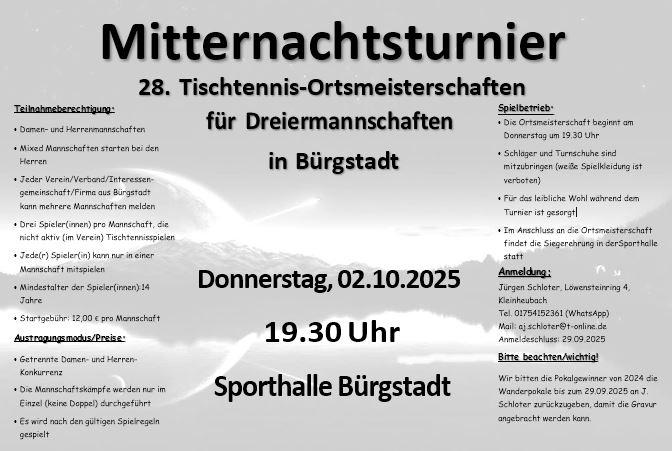 Die Tischtennisabteilung des TV Bürgstadt lädt zur jährlichen Otrsmeisterschaft am 02.10.25 ein und freut sich auf spannende Spiele und einen geselligen Abend. Für Essen und Trinken ist bestens gesorgt, auch Zuschauer kommen sicher auf ihre Kosten. Weitere Infos durch Klick auf das Bild.